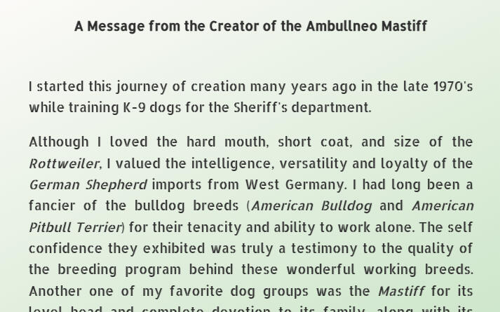 I started this journey of creation many years ago in the late 1970's while training K-9 dogs for the Sheriff's department.Although I loved the hard mouth, short coat, and size of the Rottweiler, I valued the intelligence, versatility and loyalty of the German Shepherd imports from West Germany. I had long been a fancier of the bulldog breeds (American Bulldog and American Pitbull Terrier) for their tenacity and ability to work alone. The self confidence they exhibited was truly a testimony to the quality of the breeding program behind these wonderful working breeds. Another one of my favorite dog groups was the Mastiff for its level head and complete devotion to its family, along with its large, intimidating size.At some point I realized that if dog fanciers like S.E. Moseley (father of the Bullmastiff), George Washington (American Founding Father and father of the American Foxhound), and Karl Friedrich Louis Dobermann (father of the Doberman) could create dogs to serve a particular purpose, then so could I. After all, I had been infatuated with dogs since I was 4 years old and read everything I could get my hands on regarding the subject. I also worked with dogs in one capacity or another since I was a boy (kennelman, veterinary assistant, dog trainer, decoy and breeder).Still, I wanted to run my ideas by the older professionals whom I looked up to and learned from in my lengthy tutelage. I shared my thoughts regarding this idea of the perfect guardian companion and the traits I wanted the Ambullneo Mastiff to possess. Then I began to look for the ideal candidate to represent each of the dog breeds involved.In total, I decided on five breeds that—together—would hopefully make the perfect blend of bulldog and mastiff. Some asked me “why bulldog” and “why mastiff,” and my answer was I simply realized that when dogs are used in a line breeding program, your dogs will eventually get smaller in size. Besides the large size of the mastiffs, I liked the guarding qualities and defense drive the mastiffs brought to the program.At the time, the Neopolitan Mastiff was very rare in Southern California, but they were prevalent in Italy, so that's where I originally went for the very best females money could buy. Procuring an English Mastiff in the U.S. for my breeding program was next to impossible because most people had never heard of such a thing at the time.I was constantly hearing, “What kind of mongrel are you trying to create, just buy an AKC dog.” People involved in kennel clubs were frightened to get involved for fear of being thrown out and turned into a pariah. However, with the right contracts created, stating their names without dog names ever being mentioned, and twice the cost they normally charged for the stud fee, deals were struck and the breeding program went from my mind, to a hand written blueprint, and finally came to fruition. This was only the beginning, but we were off and running.Though it was becoming very expensive, I was finally getting the opportunity to produce and observe the mastiffs I would select for the foundation of my program. I followed a strict protocol conducive to the above mentioned criteria and with every candidate that made the cut, the dogs got closer to what I had imagined them to be.Once the foundation mastiffs had been produced, I was ready for the infusion of the bulldog. Only after many months of continuous testing and comparing one dog to another was I able to make the decision based on the stud dog's progeny and ability to throw his many attributes. Although this was only half of the breeding program, we were well on our way.Later on the American Bulldog and Bullmastiff were introduced to the breeding program creating a 57.5 mastiff-42.5 bulldog cross; the F1 breeding stock was procured. I repeated this same program three times with different specimens and began to weave the F2, F3, and so on, until we had the dogs of today. Not long after our F7 breedings hit the ground, we were accepted for registration by the National Kennel Club and are very happy to be one of the many fine breeds to represent this fine establishment with our Ambullneo Mastiffs for the past 20+ years. That was many years ago and though we've faced many challenges, the breeding program has only gotten better as time goes on.I have been the shepherd guiding and guarding the breed from any and all adversarial entities. As the cost of dog food, kennel help, veterinary bills, water, electricity begin to skyrocket, monetary adjustments must be made and have been made. My staff, myself, and the many people involved in the breeding program will continue to produce the highest quality Ambullneo Mastiff puppies and trained adults available anywhere in the world.In the past forty years I've met many people—some who understand the complexity and importance of the continued high standards of my breeding program, and some who don't. I would like to thank all the people who have helped contribute to the success and quality of the Ambullneo Mastiff. If you are fortunate enough to own an Ambullneo Mastiff, you (like your dog) are a rare breed. And being a rare breed, the breeding program continues to grow as we create even better quality, more highly intelligent dogs. I will need the continued help and support from those people helping and supporting this wonderful breeding program. And I thank you for that.God bless you all.Mark D. Reasinger, PhD.